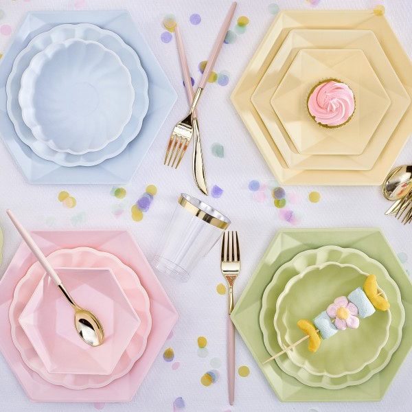 Naši tanjuri napravljeni su od 77% šećerne trske, 9% bambusa, 4% AKD-a i vode, bez ikakvih plastike, što znači da su u skladu s europskom direktivom o jednokratnoj plastici. To su naši novi vrlo kvalitetni tanjuri, savršeni za proslave, zabave i rođendane u pastelnim bojama koje su popularne i tražene.