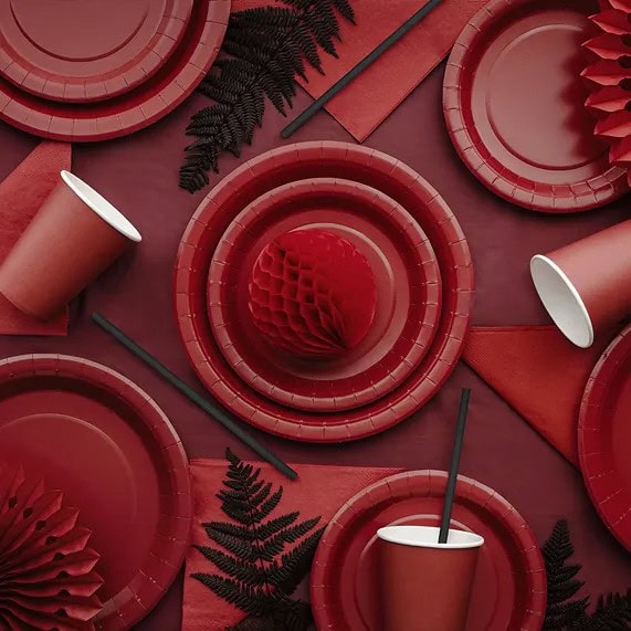 Jednokratni tanjuri praktični su za posluživanje kolača, grickalica ili glavnih jela, a tamno crvena boja lako se uklapa u različite dekoracije i party kolekcije. Laki za korištenje i ekološki prihvatljiviji od plastike, odličan su izbor za svaku prigodu.